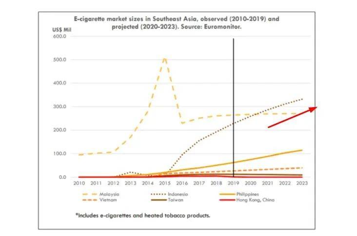 Euromonitor的數(shù)據(jù)顯示,預(yù)計2023年東南亞電子霧化總市場將達至7.66億美元,相當于超過40億人民幣。