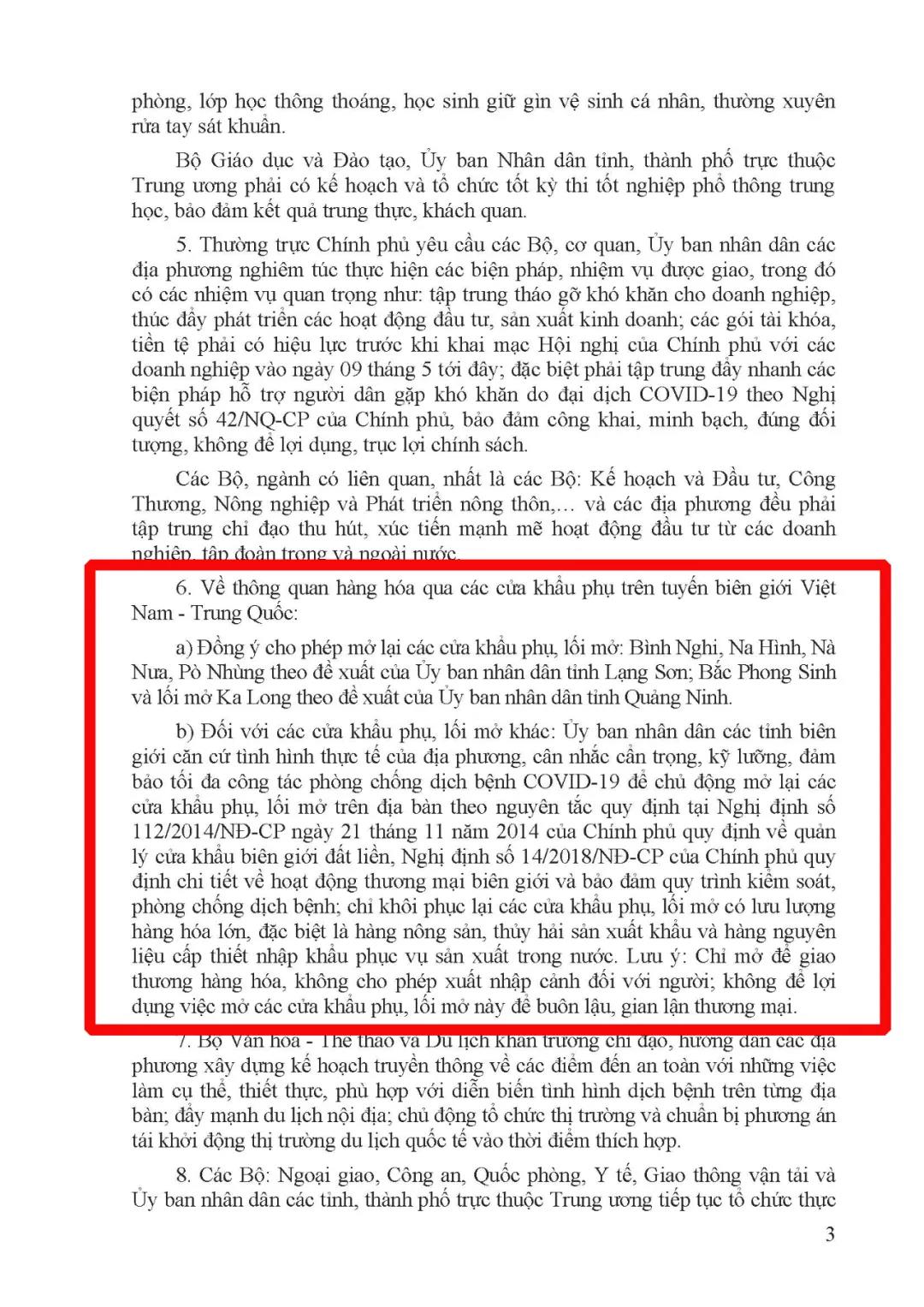總理指示北部邊境省人委會(huì)直接對(duì)總理負(fù)全責(zé),確保嚴(yán)格執(zhí)行防疫要求,僅恢復(fù)進(jìn)出口貿(mào)易通關(guān),絕對(duì)不允許個(gè)人行為的出入境及非法偷渡,嚴(yán)格管控邊境,杜絕走私,在超出權(quán)限范圍的問題出現(xiàn)時(shí)迅速向總理報(bào)告。